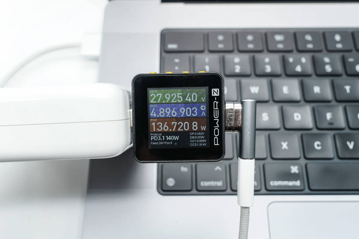 یہاں تک کہ... یہ 140W تیز چارجنگ کو بھی سپورٹ کرتا ہے، اور اڈاپٹر Apple کے 140W گیلیم نائٹرائڈ چارجر اور MagSafe 3 فاسٹ چارجنگ کیبل سے منسلک ہے۔ اس وقت، چارجنگ وولٹیج 28V ہے اور پاور 135.72W ہے۔