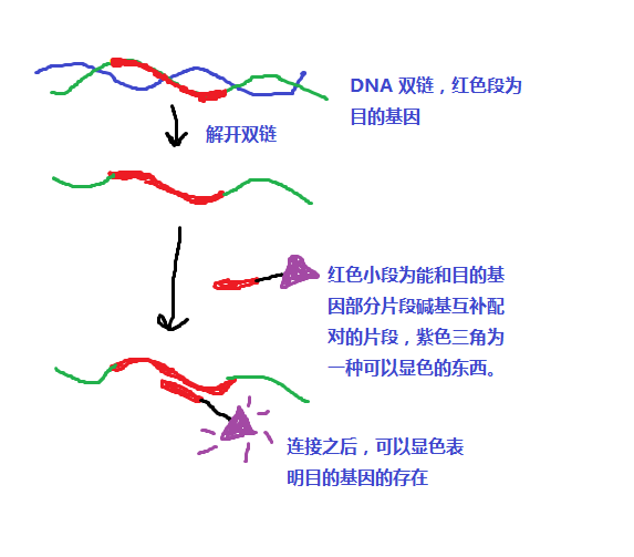مناسب پی ایچ، درجہ حرارت، اور آئنک طاقت کے تحت، ڈی این اے پروب نمونے میں مکمل طور پر بغیر لیبل والے سنگل سٹرینڈڈ ڈی این اے یا آر این اے کے ساتھ ہائیڈروجن بانڈ بنا سکتا ہے جس کی مالیکیولر ڈینیچریشن، رینیچریشن، اور بنیادی تکمیلی جوڑی کی اعلی درستگی کو بروئے کار لا کر ٹیسٹ کیا جائے۔ ایک ڈبل پھنسے ہوئے کمپلیکس بنانے کے لئے یکجا کریں۔